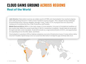 Middle East and Africa: MEA is in the early stages of cloud adoption, focusing on foundational readiness at the country level. While the overall cloud share is 28.9 %, momentum is building— Saudi Arabia drives growth through local data center mandates, South Africa leads as a regional benchmark at 53.5 %, and opportunities are expanding across the UAE, Qatar, and Oman.