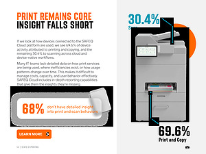 If we look at how devices connected to the SAFEQ Cloud platform are used, we see 69.6 % of device activity attributed to printing and copying, and the remaining 30.4 % to scanning across cloud and device-native workflows.