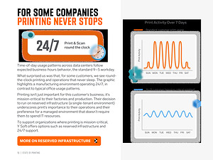 What surprised us was that, for some customers, we see roundthe-clock printing and operations that never sleep. The graphic highlights a manufacturing environment operating 24 / 7, in contrast to typical office usage patterns.