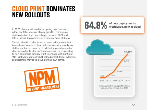 This acceleration reflects more than market momentum. As customers made it clear that print wasn ' t a priority, we shifted our focus toward a cloud-first approach aimed at eliminating day-to-day print management. By responding to how customers actually want to engage with print, our“ No Print Management” shift helped unlock faster adoption as customers moved to cloud on their own terms.