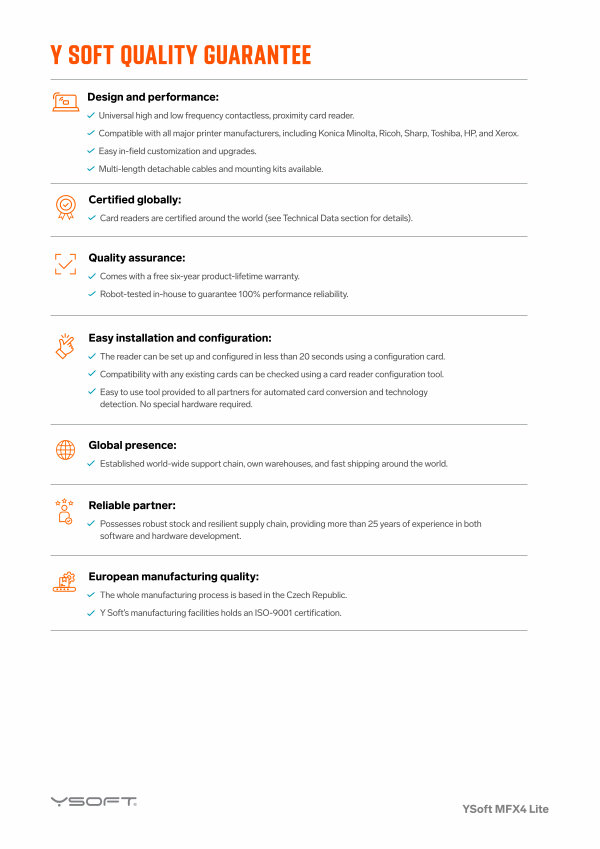 The whole manufacturing process is based in the Czech Republic. Y Soft’ s manufacturing facilities holds an ISO-9001 certification.