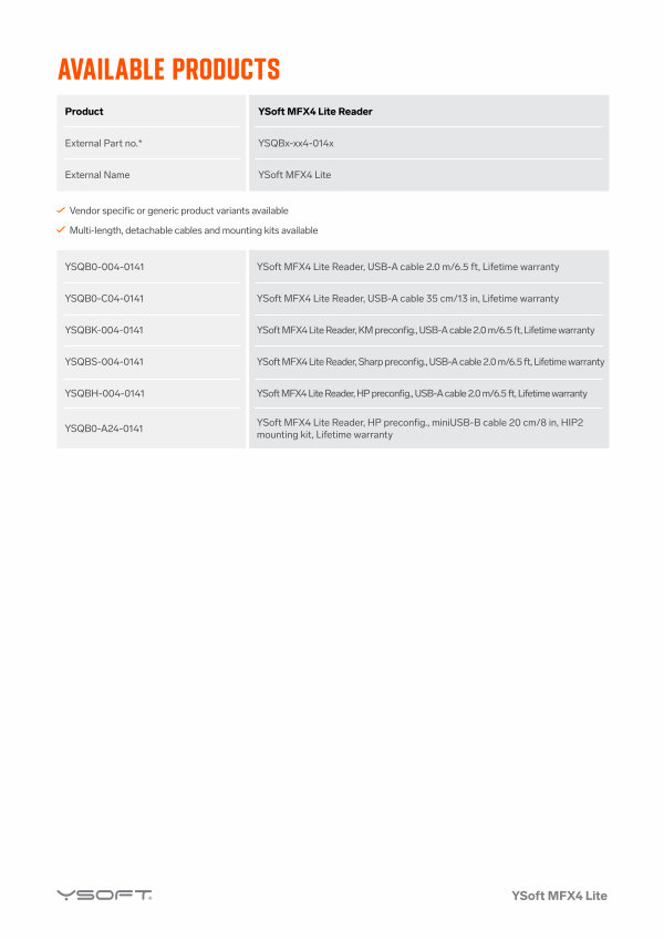 YSQB0-004-0141 YSoft MFX4 Lite Reader, USB-A cable 2.0 m / 6.5 ft, Lifetime warranty
