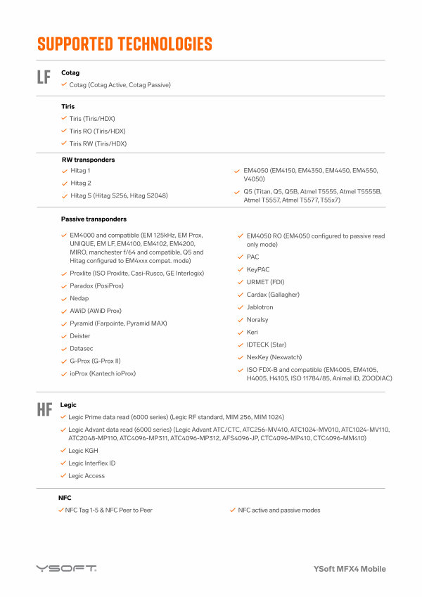 EM4000 and compatible( EM 125kHz, EM Prox, UNIQUE, EM LF, EM4100, EM4102, EM4200, MIRO, manchester f / 64 and compatible, Q5 and Hitag configured to EM4xxx compat. mode)
