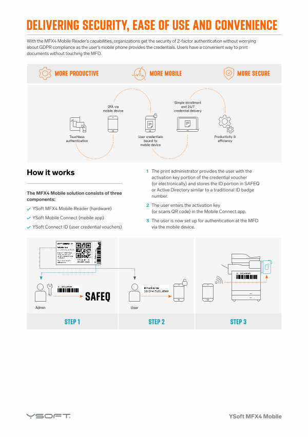YSoft MFX4 Mobile Reader( hardware) YSoft Mobile Connect( mobile app) YSoft Connect ID( user credential vouchers)