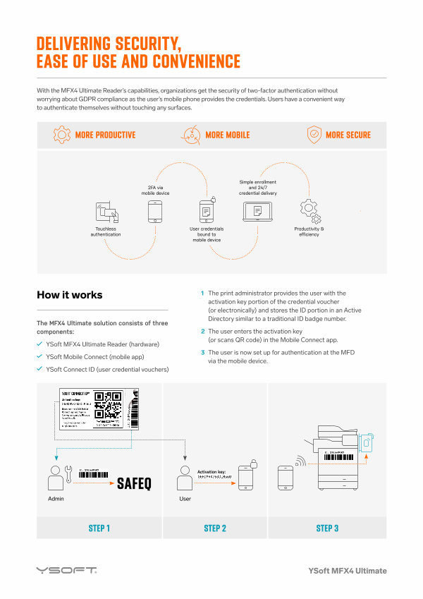 YSoft MFX4 Ultimate Reader( hardware) YSoft Mobile Connect( mobile app) YSoft Connect ID( user credential vouchers)